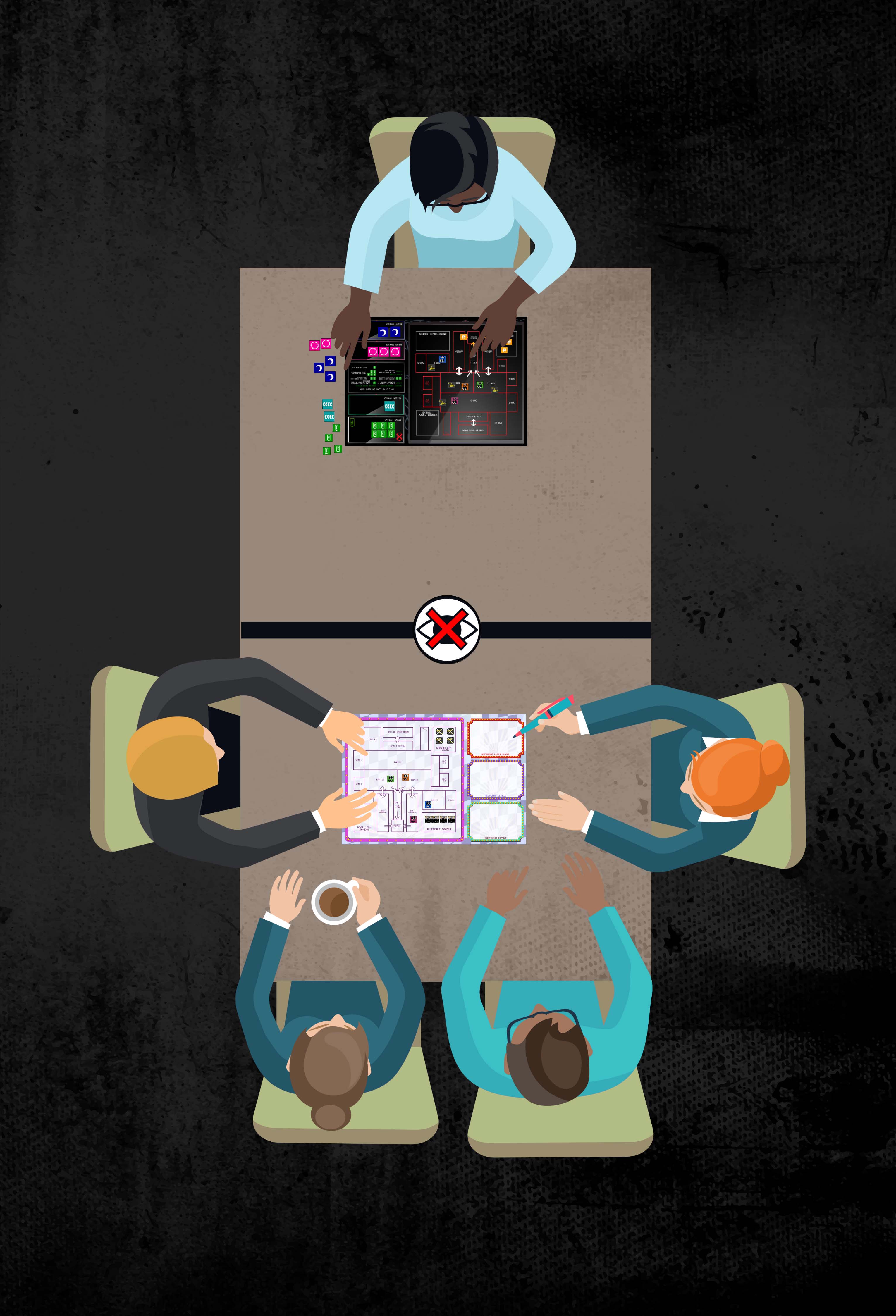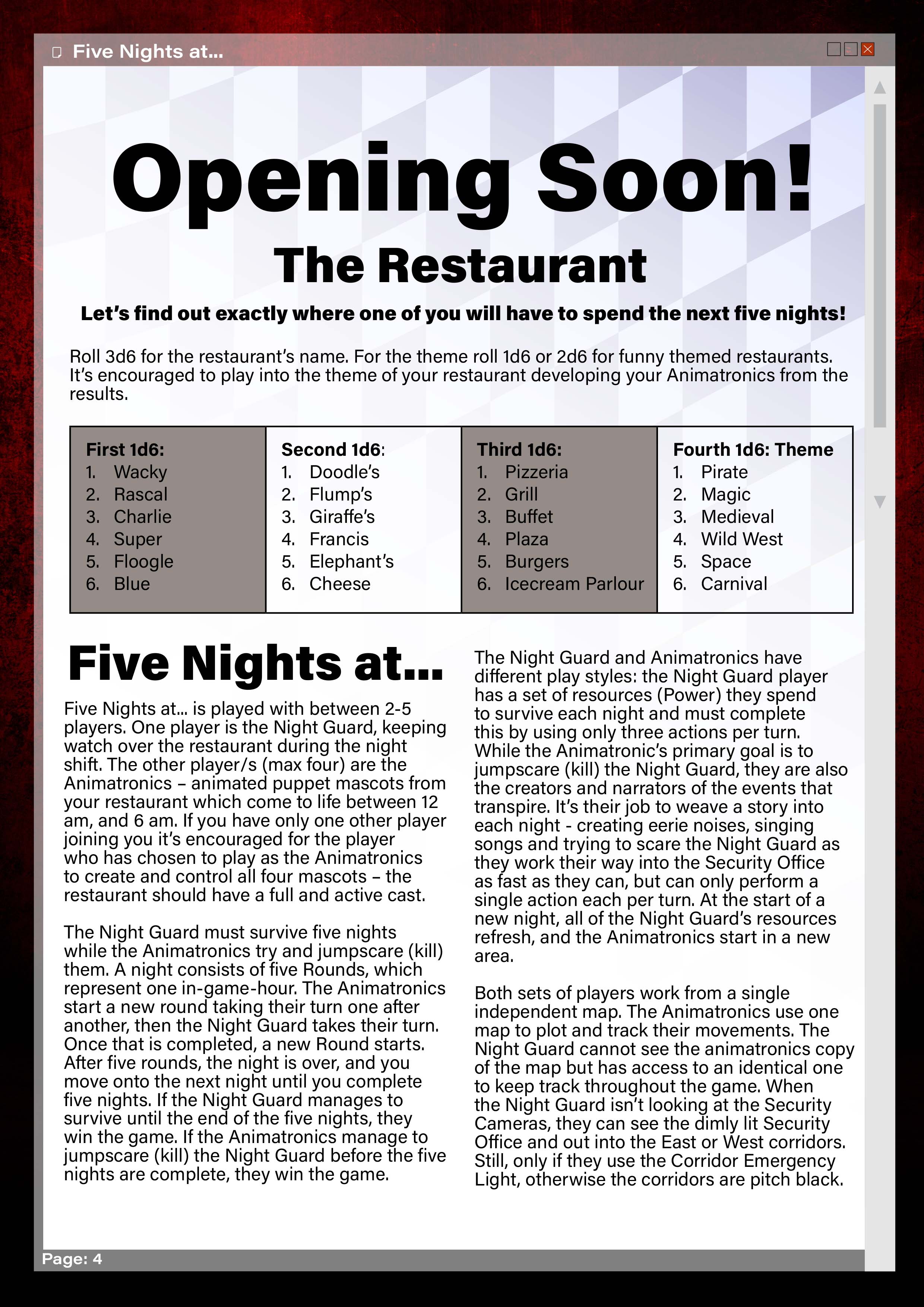 Five Nights at... is played with between 2-5 players. One player is the Night Guard, keeping watch over the restaurant during the night shift. The other player/s (max four) are the Animatronics – animated puppet mascots from your restaurant which come to life between 12 am, and 6 am.